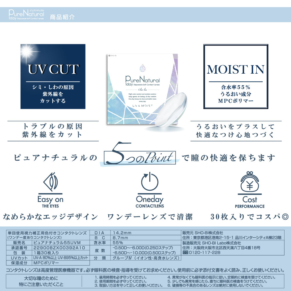 アキュビューやシード等他社製品ご使用の方も是非お試しください 【販売名】ピュアナチュラル55UVM 【使用期間】1日使い捨て 【入数】1箱30枚入 【POWER】-0.50D〜-6.00D(0.25Dステップ)、-6.50D〜-10.00D(0.50Dステップ) 【DIA】14.2mm 【BC】8.7mm 【含水率】55% 【製造国】台湾 【商品区分】高度管理医療機器 【承認番号】22900BZX00392A10 【製造販売元】SHO-BI Labo(株) 【高度管理医療機器等販売業賃貸業許可番号】30港み生機器第191号 【広告文責】粧美堂株式会社 東京都港区港南2-15-1 品川インターシティA棟23階 TEL:03-5422-9600 ●コンタクトレンズは高度管理医療機器です。