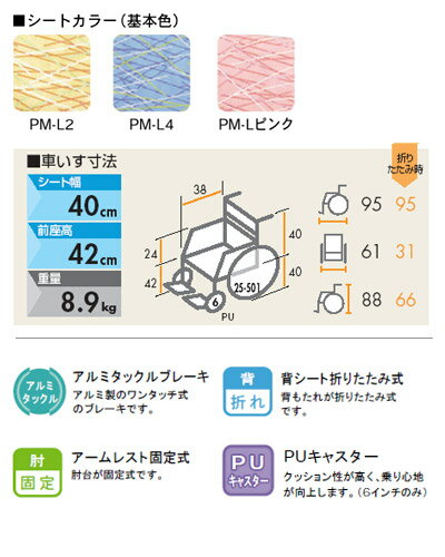 主要諸元 型番 NA-L8 サイズ 全幅61×全長95×全高88cm 折りたたみ サイズ 全幅31×全長95×全高66cm 座幅 40cm 前座高 42cm 後座高 40cm シート奥行 38cm 背もたれ高さ 40cm 肘かけ高さ 25cm 車輪サイズ 前輪6インチ、後輪25インチ 重量 8.9kg ・自走型で8kg台を実現。